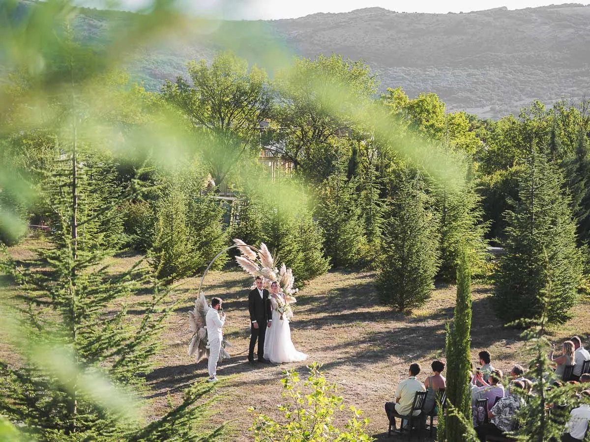 Рядом есть несколько площадок для проведения свадебной церемонии на выбор: на газоне в окружении елей, или под красивой ротондой с панорамным видом на Байдарскую долину и живописный горный закат.